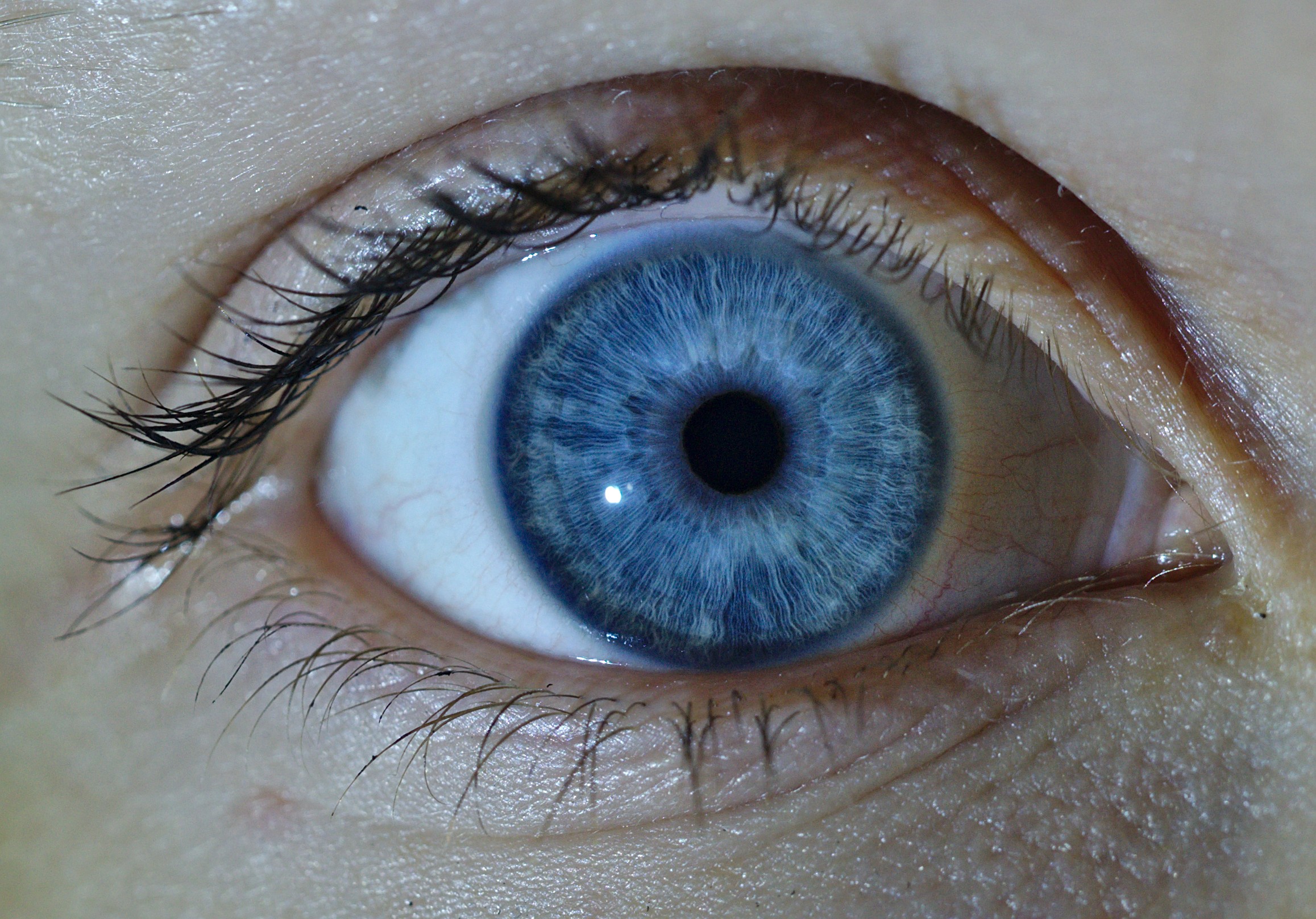 Un color intenso azul con un gran contraste debido a la lateralidad de la luz. Se aprecia muy bien el iris. Se ve una periferia azul grande un poco entrada por arriba por la periferia blanca.