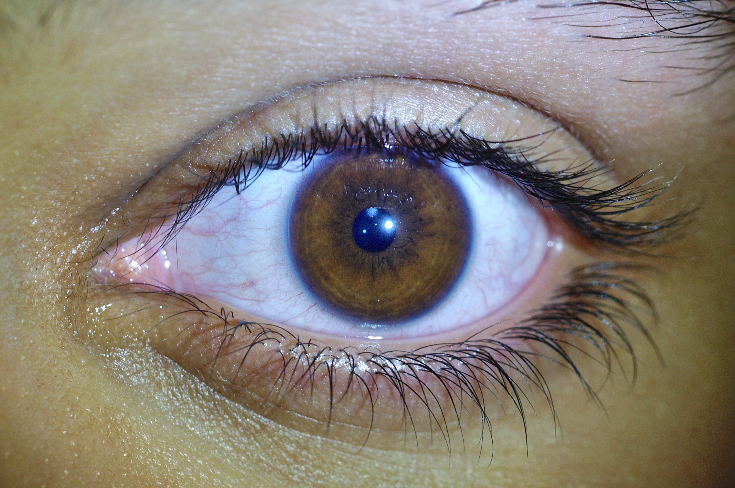 Parece que dedica mucho tiempo al ordenador pues tiene los ojos rojos, irritados en mil capilares sanguíneos irrigando la zona blanca. También tiene un par de manchitas tan pequeñas que apuesto a que, sin foto, nadie las había notado antes.