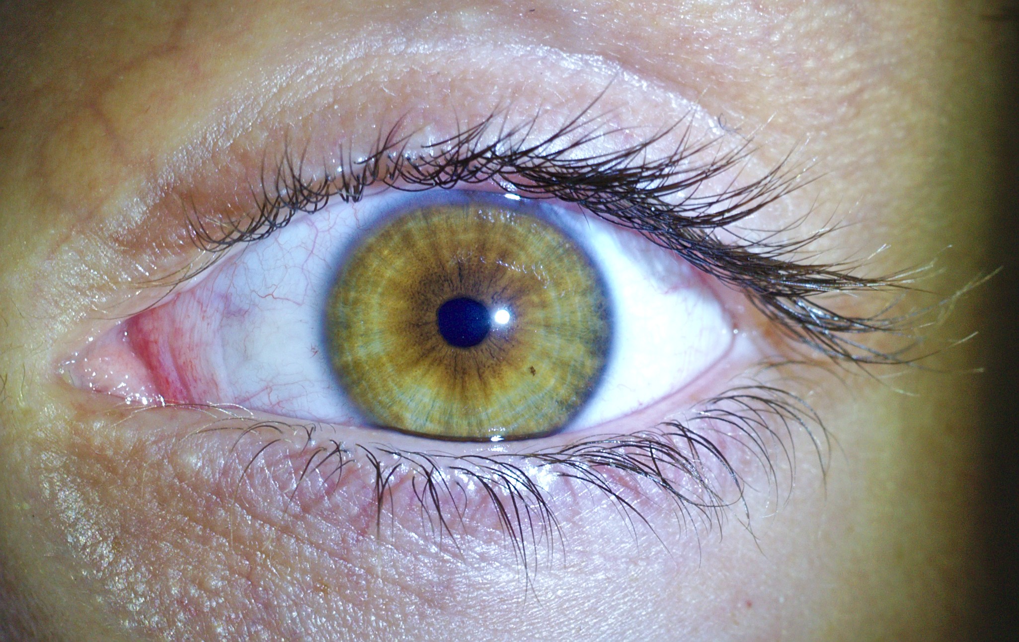 Este iris tiene muchos anillos y bastante cerrados. hay zones en que se pueden ver partes de 4 o cinco anillos aunque los que dan bastante la vuelta son solo tres. Es interesante ver que este ojo que parece castaño ligeramente verde en realidad al mirarlo de cerca es prácticamente amarillo y también es curioso ver que tiene un cráter muy pequeñito y algo rugoso.