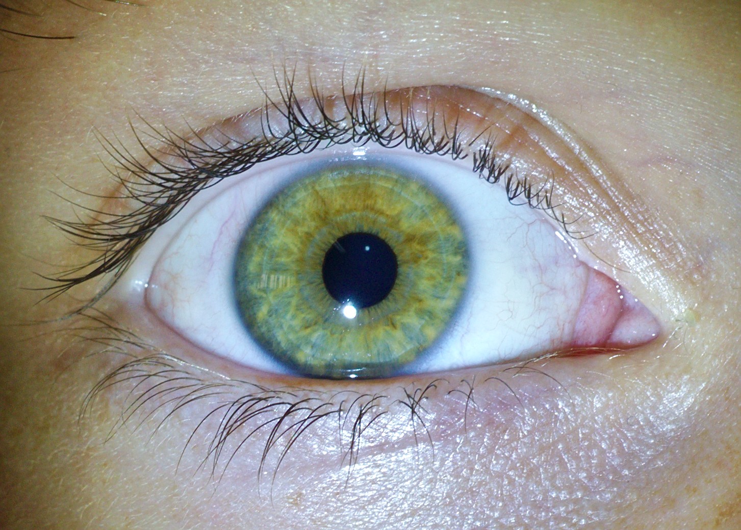 Parece que el iris tiene una figura de un sol amarillo dentro con sus rayos saliendo en forma radial hacia afuera en un ojo verde muy iluminado. Los amarillos y los claros hacen un muy bonito sol y semi-arcoíris. La forma del ojo también es especial, ocupa todo el espacio disponible. Es muy ligeramente asimétrico porque un lado es más grande que el otro lo que no creo que le cause ningún problema y lo que sí creo que notará es que no está enrojecido quizás por ser muy fuerte o por no haber excesivo uso de pantallas de ordenador. Mi impresión es que destaca por ser grandote y sano a parte por lo bonito de su soleado iris.