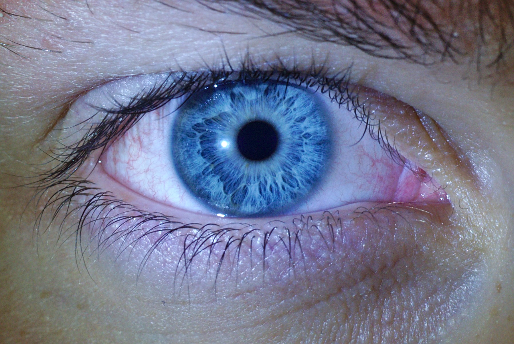 Este es un ejemplo de ojos azules con mucha fibrillas pero de los que tienen abundantes cavidades tras un gran cráter. Los ojos azules van de un extremo super fibrado sin apenas cavidades al otro extremo del que este es un ejemplo. Tan agujereado que sorprende en contrastes y formas. Los capilares sanguíneos de la zona blanca están unos montados sobre otros haciendo que sean unos ojos un poco enrojecidos, quizás por exceso de pantallas de ordenador, supongo.