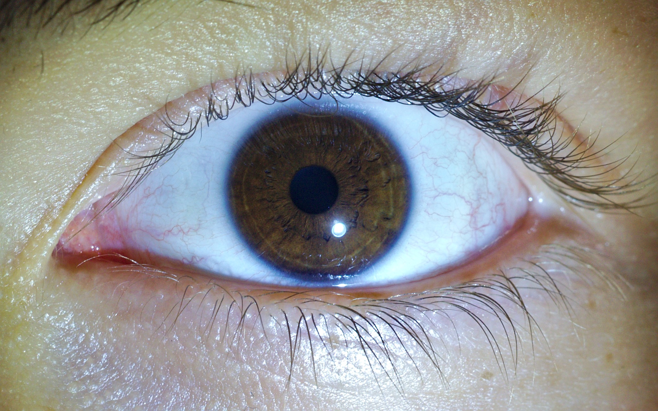 Esta vez si me atrevo a afirmar que este puede ser un caso de policromatosis aunque no es fácil. Primero porque no hay una separación clara entre las dos zonas de colores. Arriba a la derecha de la imagen se ve que si se contrastan mucho las dos zonas con una frontera definida pero al otro lado un color entra en el otro. Tener dos colores de ojos en un ojo o en los dos es algo que no ocurre mucho y desde luego para alguien que le gusta fotografiarlos, es un caso especial que he tenido suerte de fotografiar. Me gustaría rehacer la foto para ver si con la luz más de frente no ocurre esto y se puede ver con más claridad. Si el ojo es más claro la foto necesita unos parámetros, si el iris es más oscuro otros y la diferencia es importante para apreciar los detalles de ambas zonas. Otra curiosidad es como los anillos son diferentes en una zona u otra. No mucho pero un poco sí. Arriba parece que los anillos se alejan a la periferia y a la derecha parece que al entrar en la zona más marrón se alejan un poco y se hacen más finos, menos presentes.