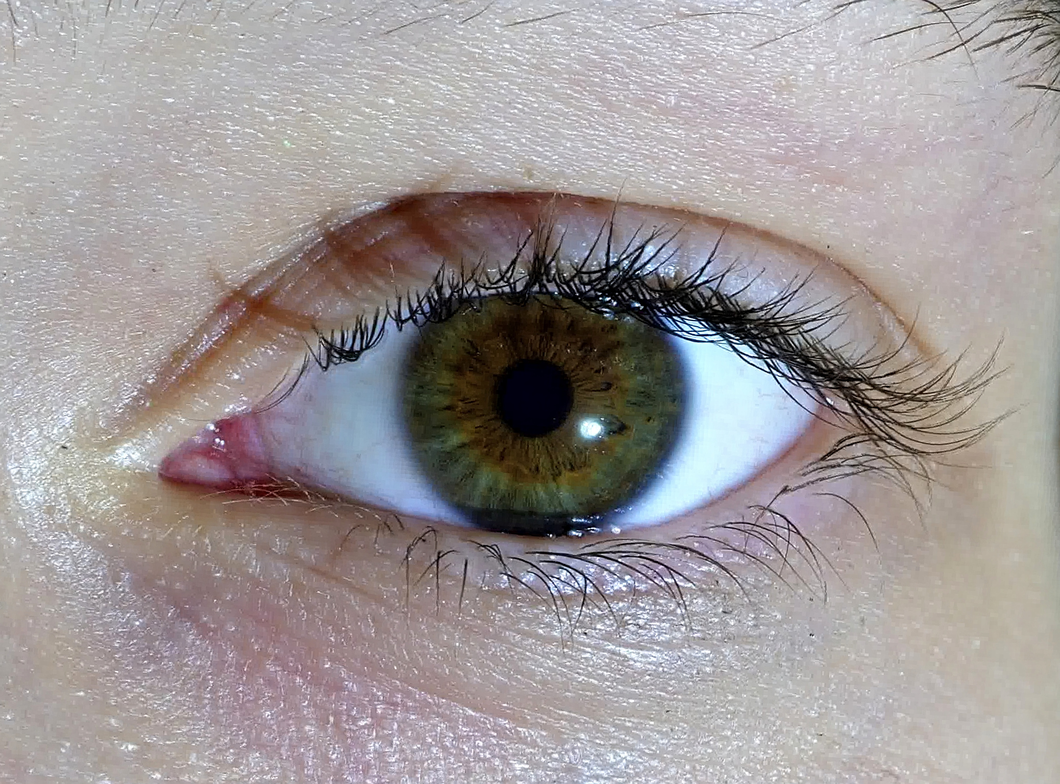 No sé si poner ojos castaños o verdes porque la mitad exterior del ojo es Verde y tiene fibrillas como tienen los ojos azules y los verdes.